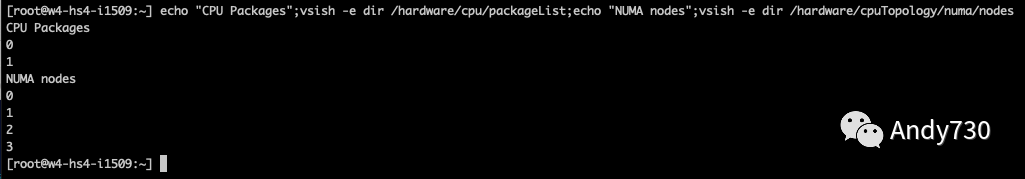 echo "CPU Packages";vsish -e dir hardware/cpu/packageList;echo "NUMA nodes";vsish -e dir hardware/cpuTopology/numa/nodes