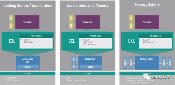 CXL 1.0于2019年3月首次亮相,支持在一组丰富的协议之间进行动态多路复用,其中包括I/O(CXL.io,基于PCIe)、缓存(CXL.cache)和内存(CXL.memory)语义。CXL在CPU(主机处理器)和所连接的CXL设备上的任何内存之间维护一个统一、一致的内存空间。允许CPU和设备共享资源并在同一内存区域上运行,以实现更高的性能、更少的数据移动和软件堆栈的复杂性,从而实现三种主要用途,如图1所示。