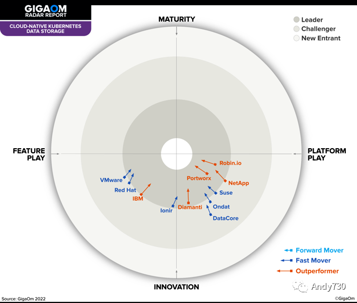 正如您在雷达图中看到的,云原生 Kubernetes 数据存储空间正在快速发展,解决方案具有创新性,市场响应是动态的。这种情况解释了为什么像去年一样,雷达的上半部分没有供应商,因为客户需求和供应商功能不断发展。