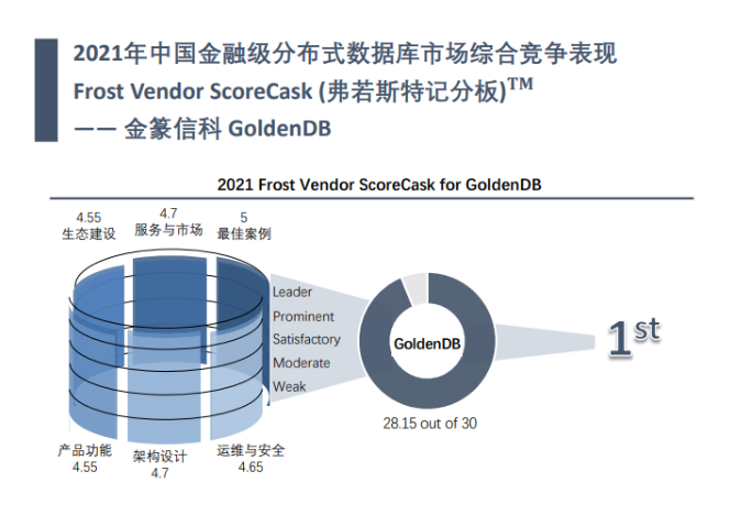 沙利文联合头豹研究院研究发现,中国金融级分布式数据库处于成熟落地的高增长市场阶段,因此,针对报告中的竞争主体根据其在产品功能、架构设计、运维与安全、生态建设、服务与市场、最佳案例六个维度二十八项大指标,对中国金融级分布式数据库市场竞争力多因素分层次评估。最终由 Frost Vendor ScoreCask 综合评分,金篆信科 GoldenDB分布式数据库荣膺2021年金融级分布式数据第一位置。