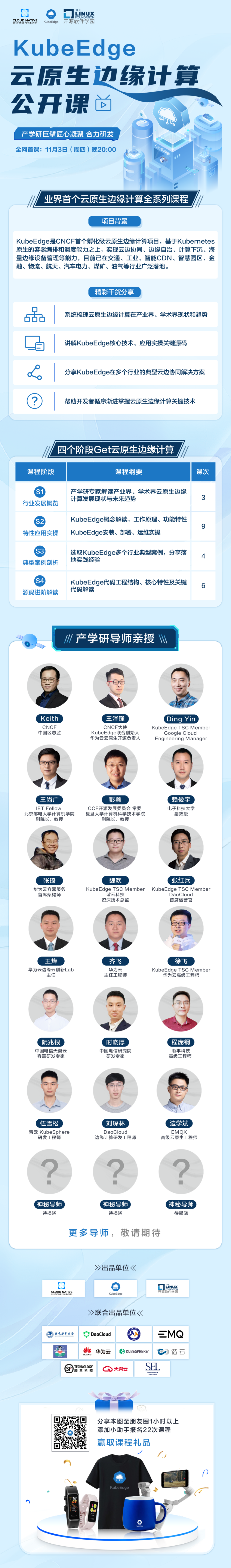 KubeEdge云原生边缘计算公开课全程免费,直播整体课程共包含22次课程安排(11月3日周四开始至1月初,每周1-2课次),从技术赋能,到实践总结,和你一起深度理解和应用边缘计算。