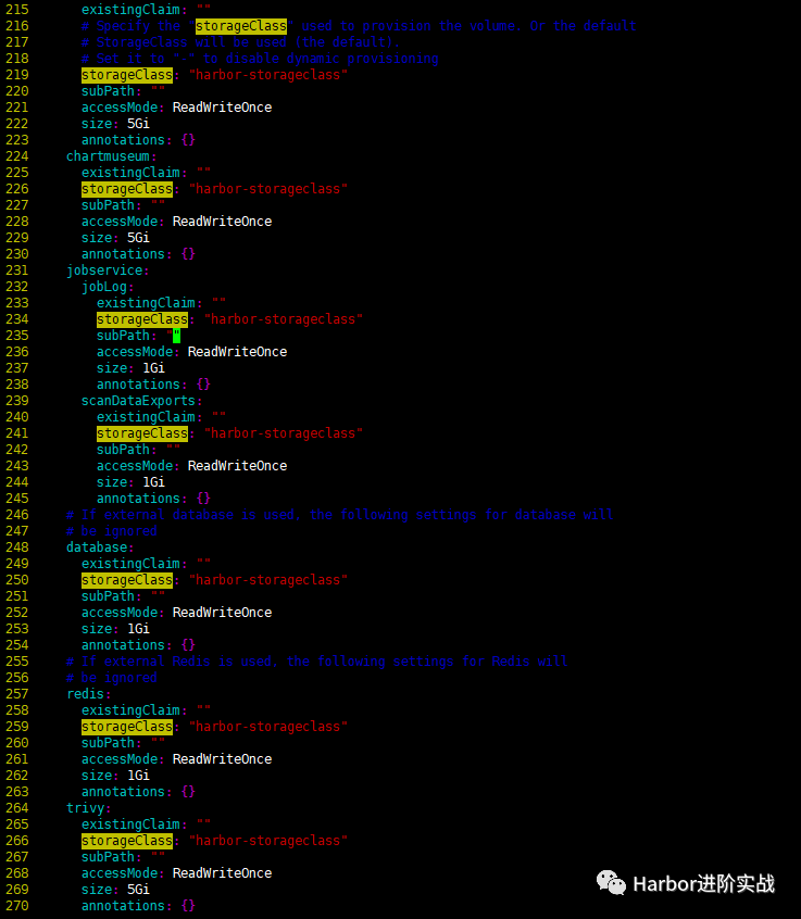 storageClass: "harbor-storageclass" # 前面创建的StorageClass,其它组件同样配置