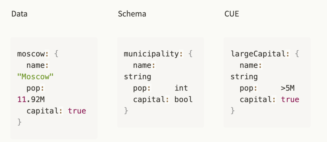 在定义 JSON 数据时,我们通常会将 Data 和 Schema 分开处理。而 CUE 则将二者结合在一起,既可以指定数据字段类型,也可以直接填写具体值,也就是 CUE 并不会特意地区分 “类型” 和 “值”, string