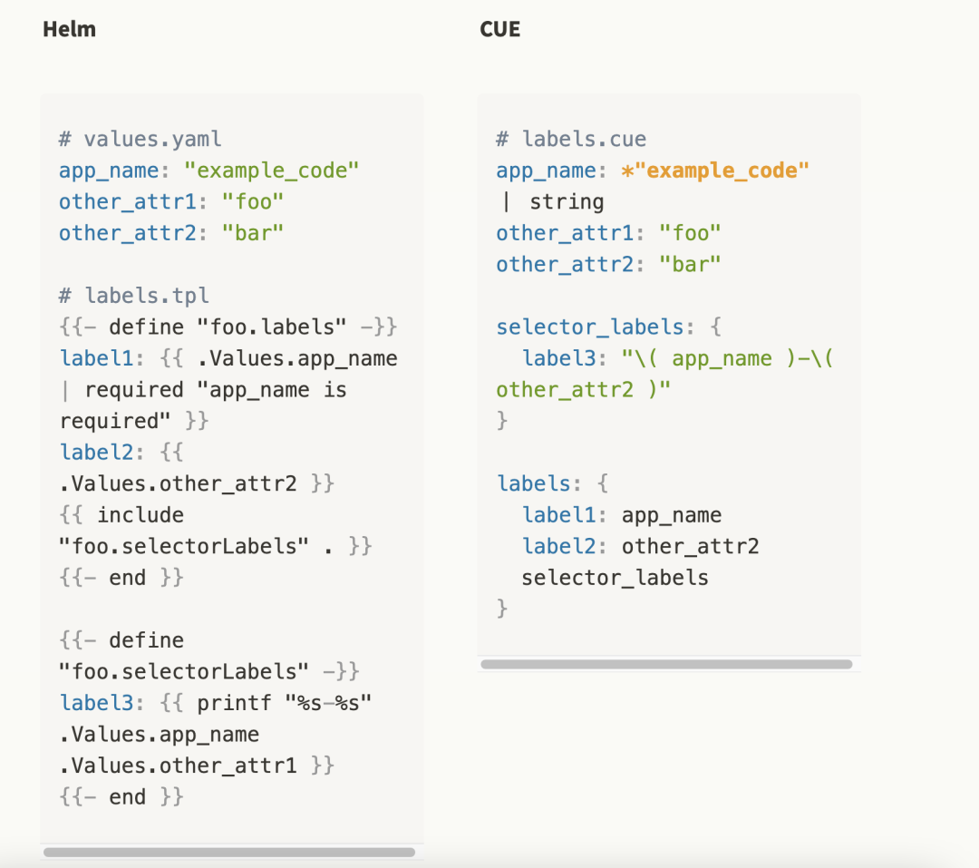 这样的写法立刻让我们想到了一个类似的工具—— Helm,作为较早的 CNCF 毕业项目,Helm 已经慢慢演进成在 k8s 配置定义领域的事实意义上的工业标准。那么相较于 Helm,用 CUE 来写配置文件渲染,又有什么异同呢?