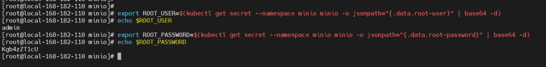 export ROOT_USER=$(kubectl get secret --namespace minio minio -o jsonpath="{.data.root-user}" | base64 -d)