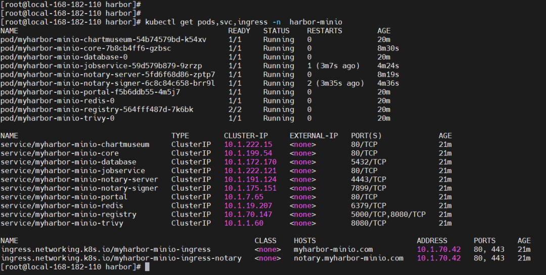 kubectl get pods,svc,ingress -n harbor-minio