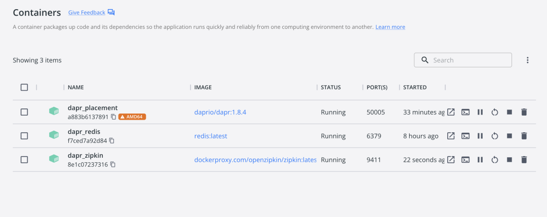 这个 tracing 服务,使用上面的命令初始化如果没有对应的容器,则可以使用docker run --name dapr_zipkin -d -p 9411:9411 dockerproxy.com/openzipkin/zipkin