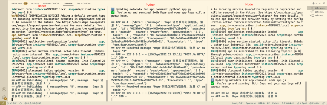 观察 Node 和 Python 订阅服务的日志。