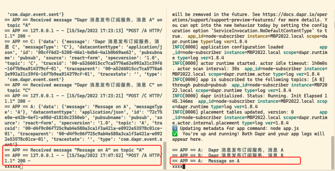 INFO[0000] app is subscribed to the following topics: [A B] through pubsub=pubsub app_id=node-subscriber instance=MBP2022.local scope=dapr.runtime type=log ver=1.8.4