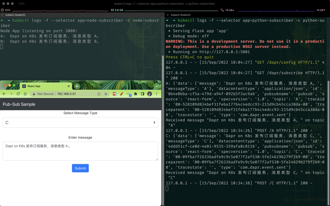 访问前端服务了。同样在前端页面发送几个不同的消息通知,然后使用 kubectl logs