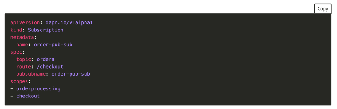 同样的方式,这是告诉 Dapr 要订阅 pubsub