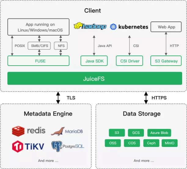 安装 JuiceFS 非常简单,你需要准备好元数据存储引擎(比如 Redis, MySQL),以及对象存储,最后下载 JuiceFS 客户端执行一行命令,就能立刻开始使用了。