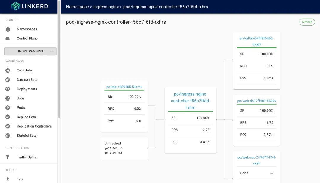 这样 ingress 控制器也被加入到网格中去了,所以也具有了 Linkerd 网格的相关功能: