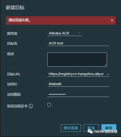 ;访问ID:阿里云镜像仓库的命名空间名称;ram账户id; 访问密码:在前面【配置访问凭证】时设置的密码; 验证远程证书:如果是自签或者非信任的证书,不可勾选该项; 点击【连接测试】看Harbor与阿里云镜像仓库ACR是否可以正常连接。