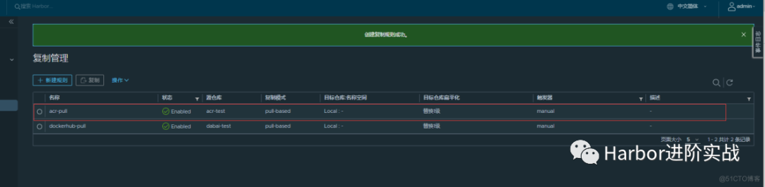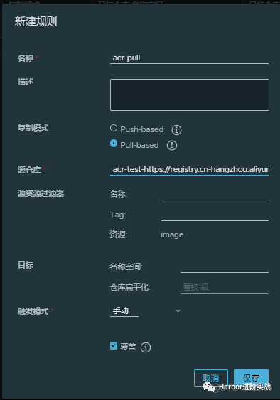 名称:自定义一个名称即可; 复制模式:pull-bashd就是将阿里云上的镜像拉到Harbor,Push则相反; 源仓库:下拉选择刚才【新建目标规则】的名称开头的; 触发模式:手动(全量)
