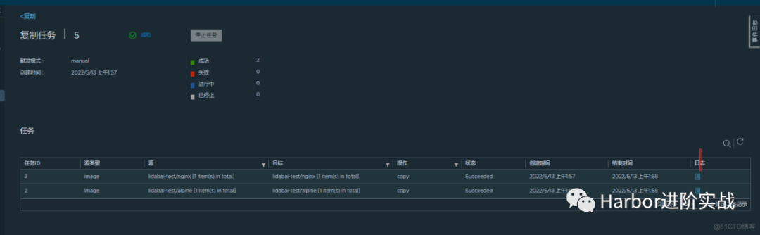 在执行复制任务完成后,查看【复制任务】对应ID的事件【成功百分比】是否为100%,如果是100%则表示全部迁移成功,然后检查两端的镜像数量是否一致。
