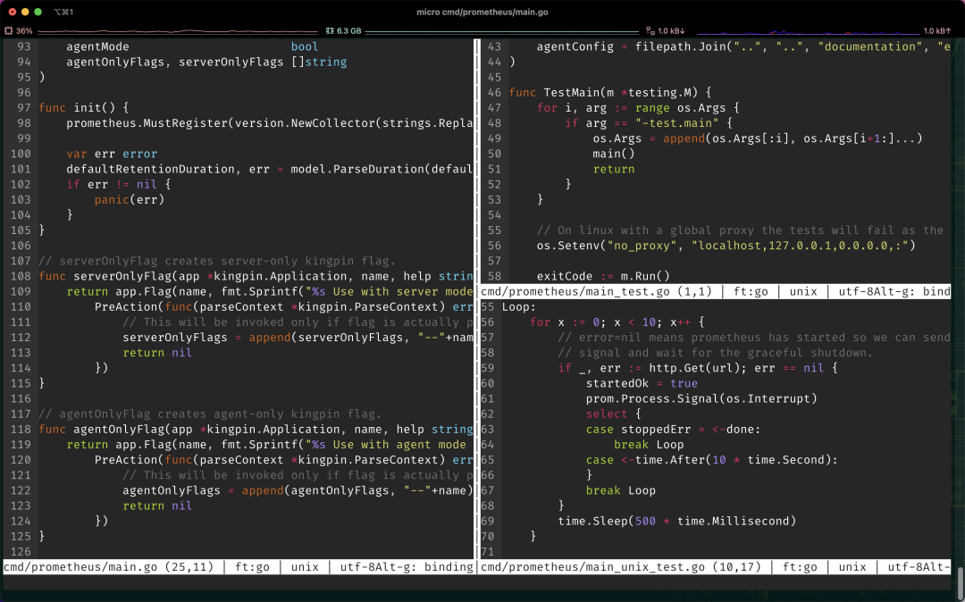 易于使用和安装。 不需要依赖或外部文件。 多光标支持。 支持通用键盘快捷键(Ctrl-s, Ctrl-c, Ctrl-v, Ctrl-z, ...)。 智能的默认值。 拆分和选项卡。 类似 nano 的菜单,帮助你记住键盘快捷键。 极好的鼠标支持:这意味着鼠标拖动可以创建一个选择,双击可以按字选择,三击可以按行选择。 跨平台(它应该能在所有 Go 运行的平台上工作)。 插件系统(插件是用 Lua 编写的):micro 有一个内置的插件管理器来自动安装、删除和更新插件。 内置 diff gutter。 简单的自动补全。 撤销持久化。 自动提示和错误通知。 超过 130 种语言的语法高亮。 颜色方案支持:默认情况下,micro 带有 16、256 和真彩色主题。 支持真彩色(将 MICRO_TRUECOLOR