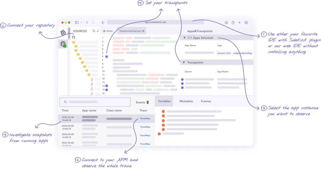 是一个开源的实时应用程序调试器,可让你在应用程序运行时对其进行故障排除。添加动态日志并在你运行的应用程序中放置不间断的断点,而无需停止和重新部署。Sidekick