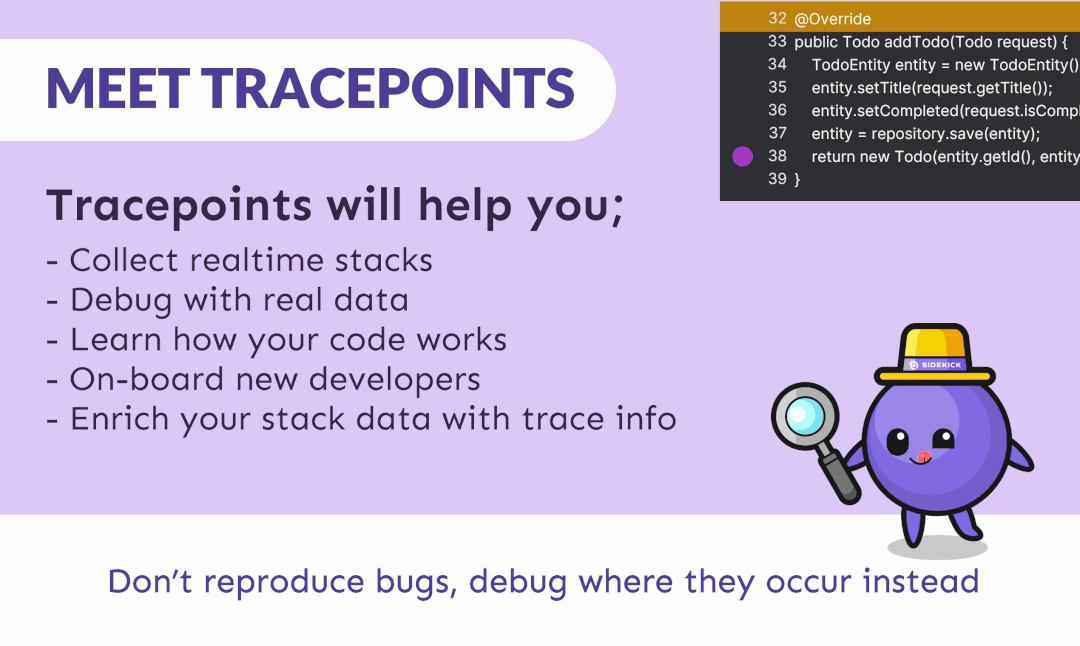消除了调试的负担,使开发人员能够为你的代码设置一个非侵入式断点,这不会中断执行,即使你的应用程序已启动并正在运行,仍然能够调试你的应用程序。