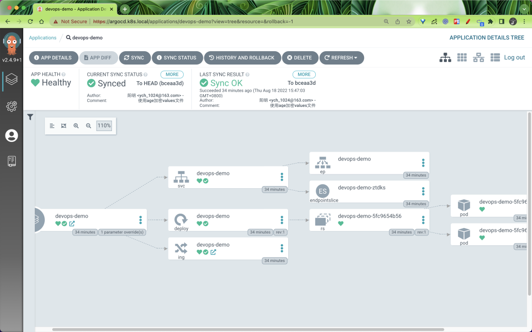 现在我们需要将该文件重新提交到 Git 仓库中去,接着我们要重新创建 Application 应用,对应的资源清单文件如下所示: