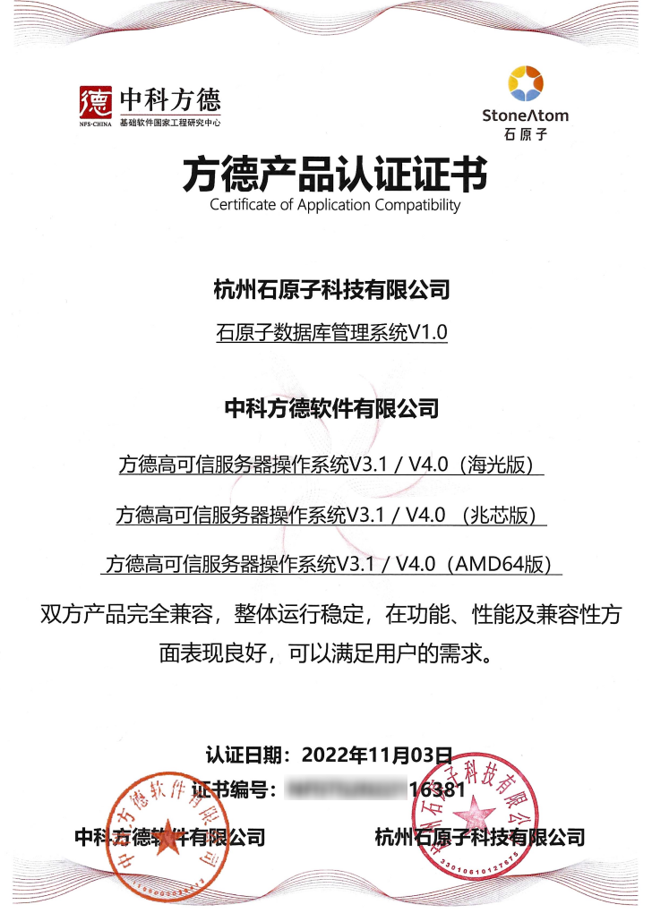 近日,杭州石原子科技有限公司(以下简称“石原子”)与中科方德软件有限公司(以下简称“中科方德”)完成产品兼容认证。石原子自主研发的 StoneDB 数据库与方德高可信服务器操作系统 V3.1/V4.0(海光版)、V3.1/V4.0(兆芯版)、V3.1/V4.0(AMD64版)等产品完成兼容性适配认证,并获得由中科方德软件有限公司颁发的认证证书。经过严格联合测试,双方软件相互兼容良好、运行稳定。