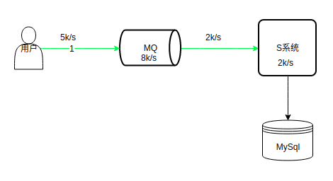 如上图所示,系统的处理能力是 2k/s,MQ 处理能力是 8k/s,峰值请求 5k/s,MQ 的处理能力远远大于数据库,在高峰期,请求可以先积压在 MQ 中,系统可以根据自身的处理能力以 2k/s 的速度消费这些请求。