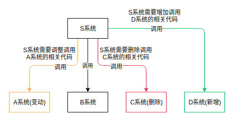 过几天,C 系统需要删除,S 紧跟着删除 C 相关代码;又过了几天,需要新增 D 系统,S 系统又要添加与 D 相关的代码;再过几天,程序猿疯了...