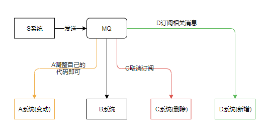 这样各个系统紧密耦合,不利于维护,也不利于扩展。现在引入 MQ,A 系统变动,A 自己修改自己的代码即可;C 系统删除,直接取消订阅;D 系统新增,订阅相关消息即可。