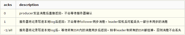 在 0.9 版本,生产者配置项 request.required.acks=-1 被 acks=all 取代,但是老的配置项还保留在文档中。