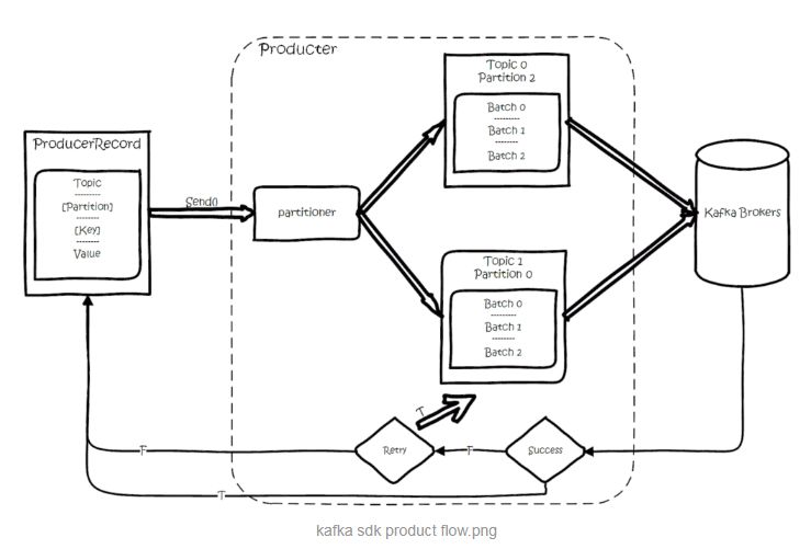 消息并不会立即发送,而是先进行序列化后,发送给 Partitioner,也就是上面提到的 Hash 函数,由 Partitioner 确定目标分区后,发送到一块内存缓冲区中(发送队列)。
