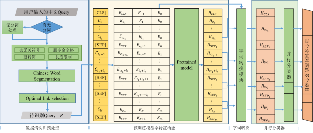 代表第i个分词对应的长度为li的字特征。基于字符片段Wi,字词转换模块聚合出每个词的特征Hwi。聚合手段可以是最大值池化max-pooling、最小值池化min-pooling、均值池化mean-pooling等方式,实验得到最大池化效果最佳。模块输出为搜索词R的词特征OutputR;通过并行分类器对搜索词的词特征OutputR中各个片段给出类目数据库中涵盖的匹配类目,并给出对应类目的匹配概率。