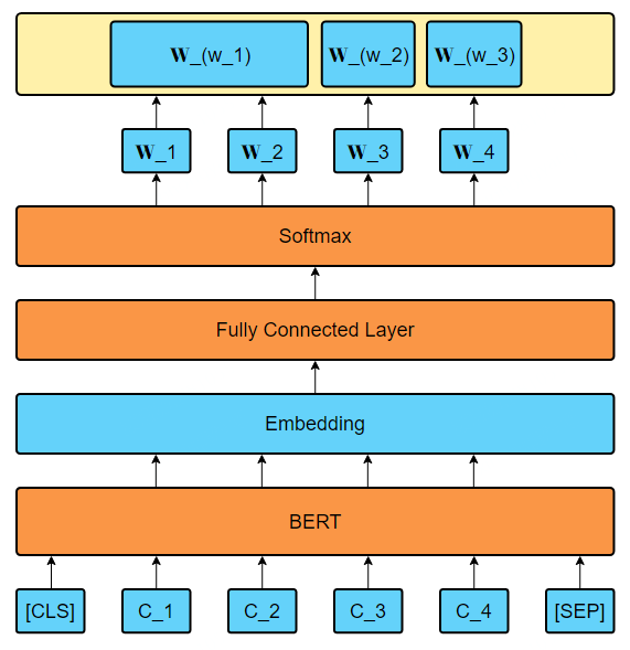模型部分主要尝试BERT作为特征提取的方法,并进一步对每个term的权重进行拟合。对于给定的输入,将其转化为BERT所能接收的形式,将通过BERT后的张量再通过全连接层进行压缩,得到一维的向量后进行Softmax处理,并用该向量对结果的权重向量进行拟合,具体模型框架如下图所示: