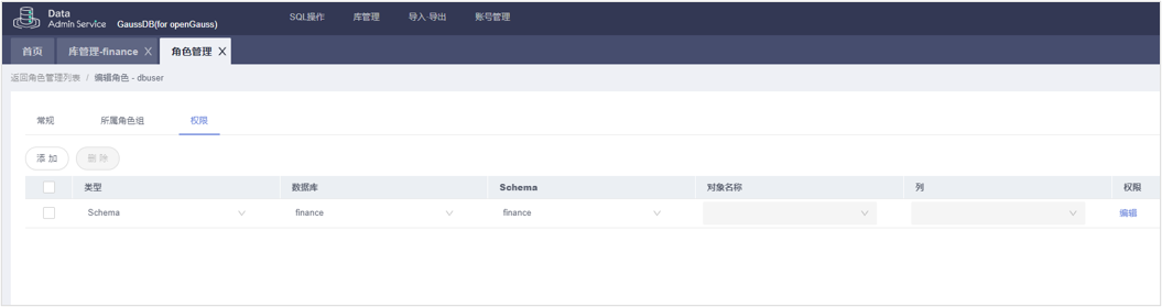 角色编辑页面中选择“权限”,再点击添加,然后根据实际要求添加相应权限。