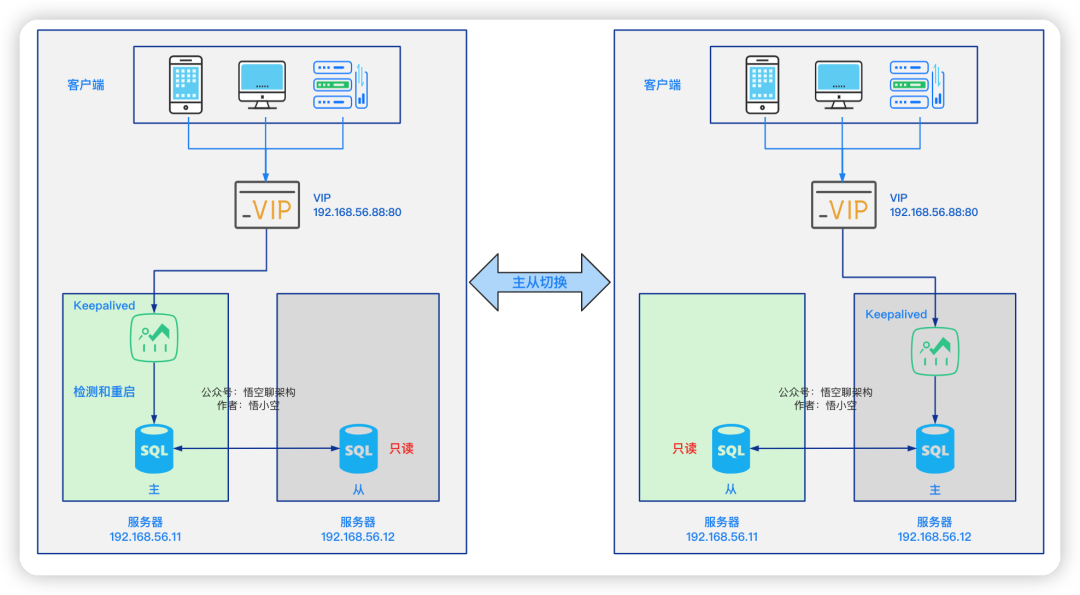 和双主模式的主从切换的区别是,从节点是只读的,Keepalived 没有启动,需要人工操作主从切换和启动 Keepalived。