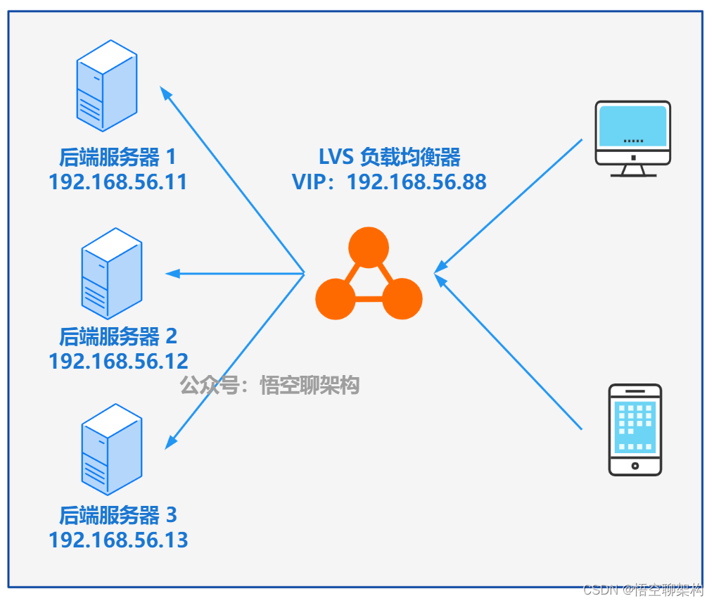 LVS 主要用在负载均衡方面,比如 Web 客户端想要访问后端服务,Web 请求会先经过 LVS 调度器,调度器根据预设的算法决定如何分发给后端的所有服务器。
