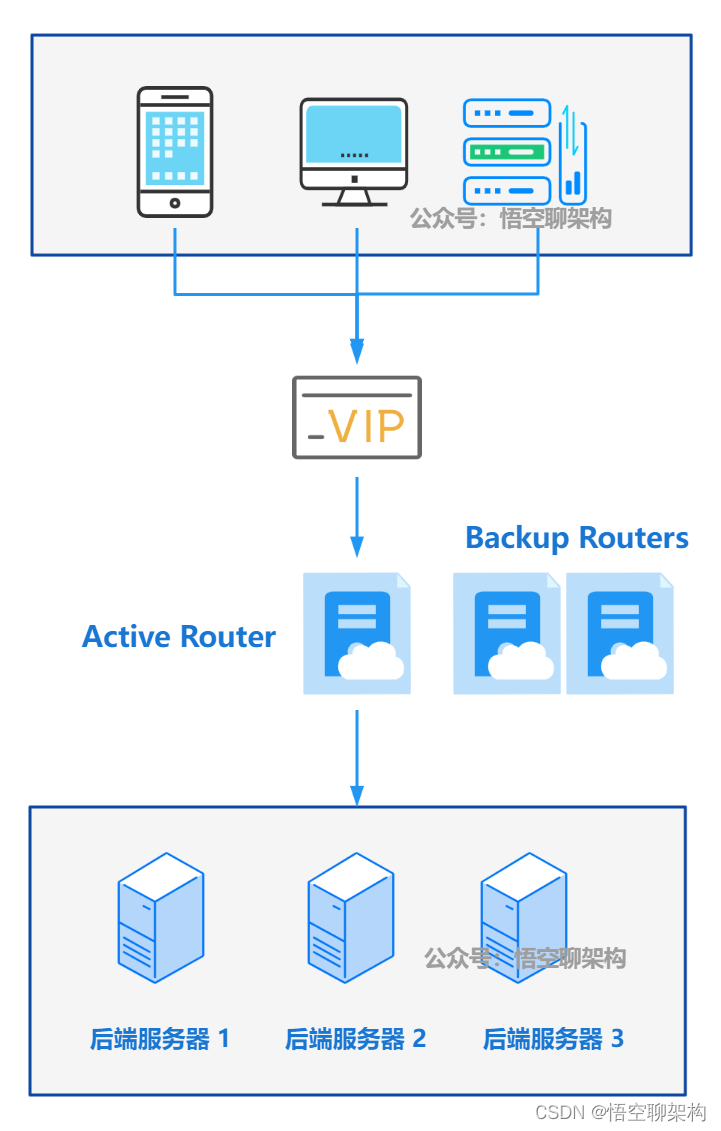 现在我们配置多台路由器(一主多备),每台路由器都有一个自己的 IP 地址,它们组成一个路由器组,其中有一个作为 Master,其他作为 Backup。然后这些路由器会虚拟出单个路由,拥有自己的 IP 地址,也就是 Virtual IP,简称 VIP。