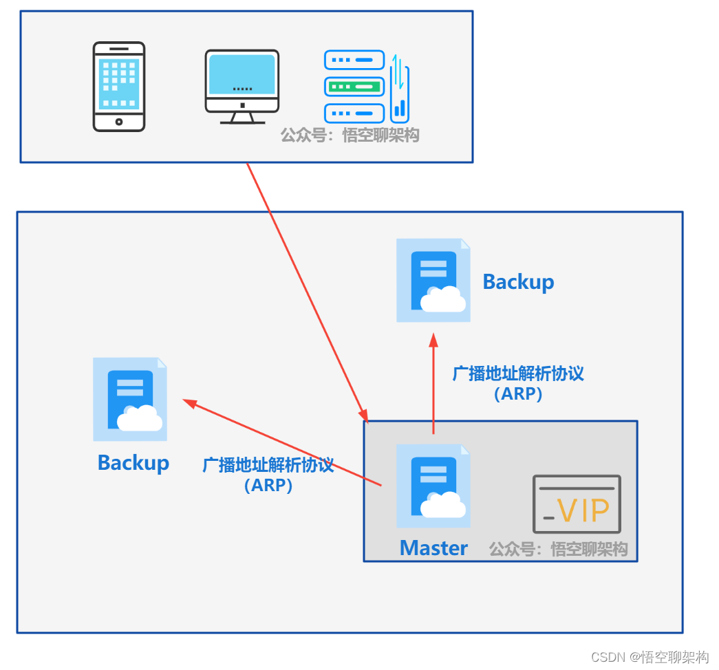 虚拟路由器和虚拟 IP。 Master 广播 VRRP 报文。 Backup 选举新的 Master。