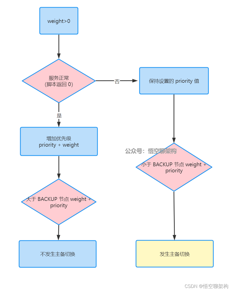 如果 MASTER 节点的 vrrp_script 脚本检测失败时,如果 MASTER 节点的 priority 值小于 BACKUP 节点 weight + priority,则发生主备切换。 如果 MASTER 节点的 vrrp_script 脚本检测成功时,如果 MASTER 节点的 priority 值大于 BACKUP 节点 weight + priority,则不发生主备切换。