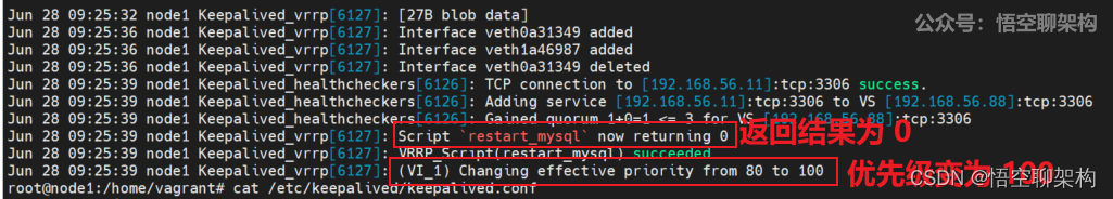 如下图所示:虽然 node1 上的 keepalived 重启 mysql 成功了,优先级也恢复成了 100,但是并没有变为 master,还是维持 backup 状态。