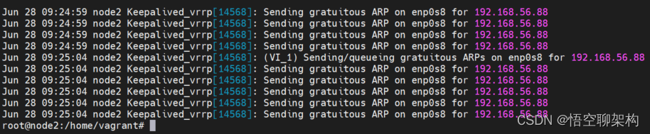 而 node2 还是 master 节点,定时向 node 1 发送 vrrp 通知,如下图所示:
