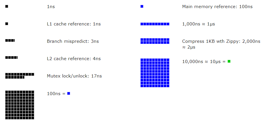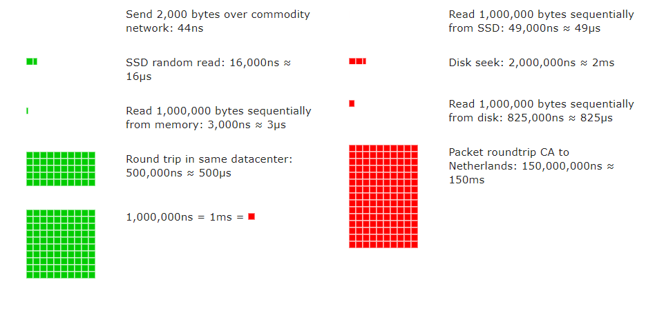 有一个非常棒的网站“Latency Numbers Every Programmer Should Know”,可以直观地查看从 1990 年到现在,高速缓存、内存、硬盘、网络时间开销的具体数值。