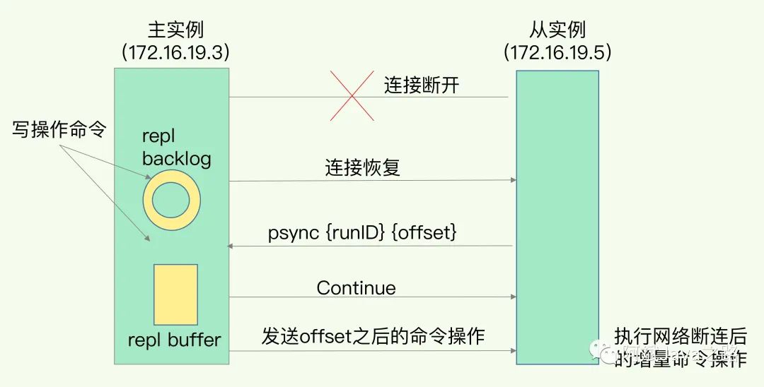 如果主从库在命令传播时出现了网络闪断,那么,从库就会和主库重新进行一次全量复制,开销非常大。从 Redis 2.8 开始,网络断了之后,主从库会采用增量复制的方式继续同步。