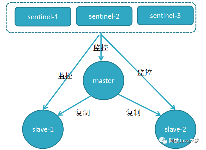 监控(Monitoring):哨兵会不断地检查主节点和从节点是否运作正常。 自动故障转移(Automatic failover):当主节点不能正常工作时,哨兵会开始自动故障转移操作,它会将失效主节点的其中一个从节点升级为新的主节点,并让其他从节点改为复制新的主节点。 配置提供者(Configuration provider):客户端在初始化时,通过连接哨兵来获得当前Redis服务的主节点地址。 通知(Notification):哨兵可以将故障转移的结果发送给客户端。