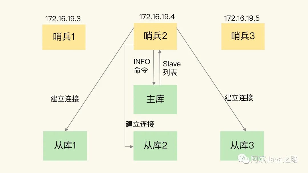 哨兵以每10秒一次的频率向主库发送INFO命令,就能获取所有从库列表,刷新从库状态了。