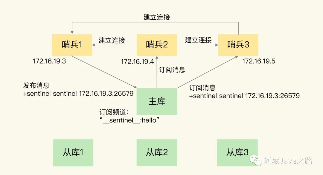 哨兵 1 把自己的 IP(172.16.19.3)和端口(26579)发布到__sentinel__:hello频道上,哨兵 2 和 3 订阅了该频道。那么此时,哨兵 2 和 3 就可以从这个频道直接获取哨兵 1 的 IP 地址和端口号。然后,哨兵 2、3 可以和哨兵 1 建立网络连接。