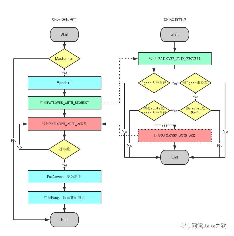 当slave发现自己的master变为FAIL状态时,便尝试进行Failover,以期成为新的master。由于挂掉的master可能会有多个slave。Failover的过程需要经过类Raft协议的过程在整个集群内达到一致, 其过程如下: