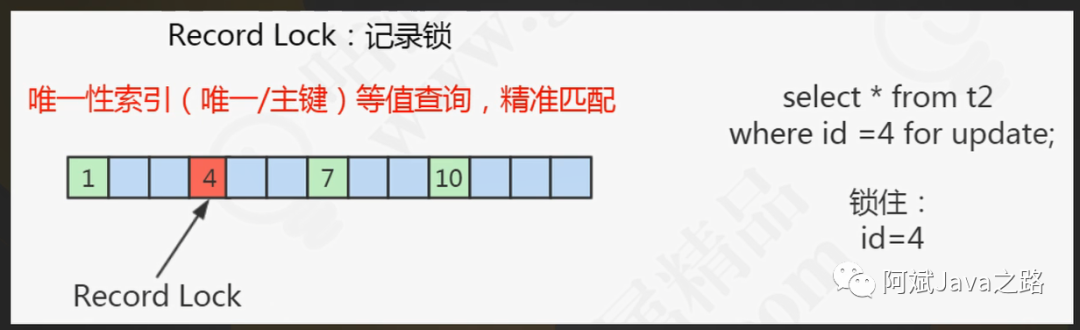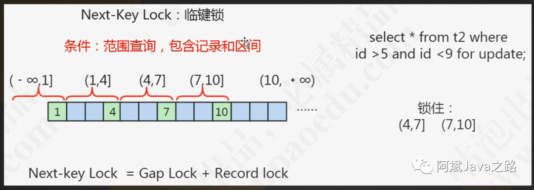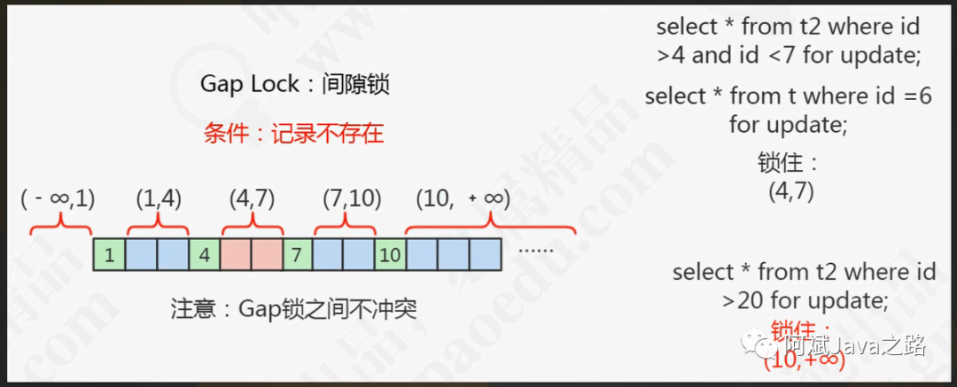 间隙锁就是锁定一个双开区间,比如我想要锁定id=6的记录,发现记录不存在,那么就需要锁定4-7的一个区间,避免之后区间内有新的记录插入。实际上,间隙锁也是锁在记录上的,只是锁的类型不同。该例中的间隙锁,是锁在7这条记录上的,类型为间隙锁。