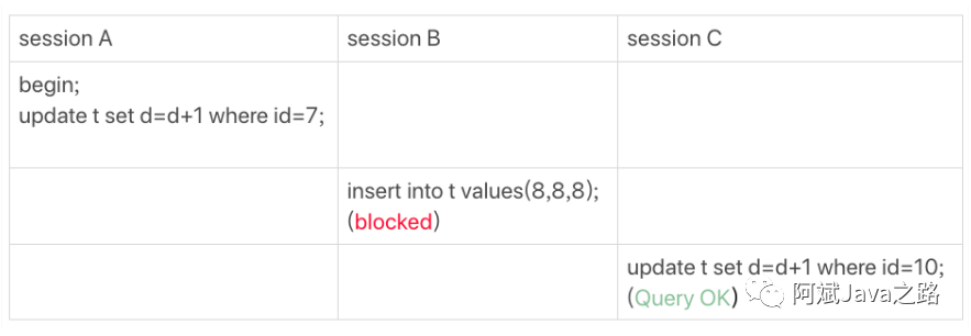 所以,session B 要往这个间隙里面插入 id=8 的记录会被锁住,但是 session C 修改 id=10 这行是可以的。