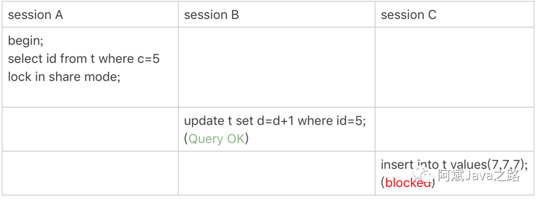 这个例子说明,锁是加在索引上的;同时,它给我们的指导是,如果你要用 lock in share mode 来给行加读锁避免数据被更新的话,就必须得绕过覆盖索引的优化,在查询字段中加入索引中不存在的字段。比如,将 session A 的查询语句改成 select d from t where c=5 lock in share mode。你可以自己验证一下效果。