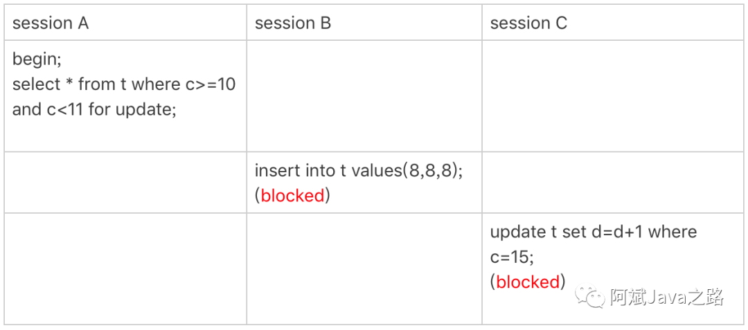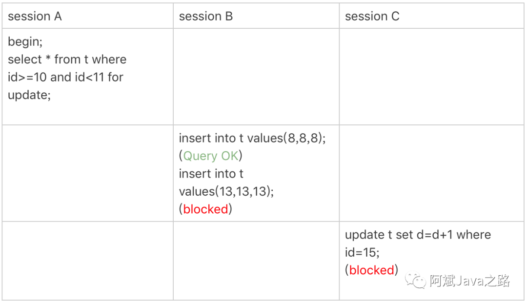 所以,session A 这时候锁的范围就是主键索引上,行锁 id=10 和 next-key lock(10,15]。这样,session B 和 session C 的结果你就能理解了。